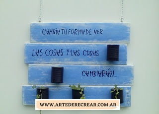 Se puede agregar unas macetas reciclando latas de arvejas, pintadas de negro, realizar unas perforaciones para el drenaje, luego con tornillo pequeño colgar en la madera.